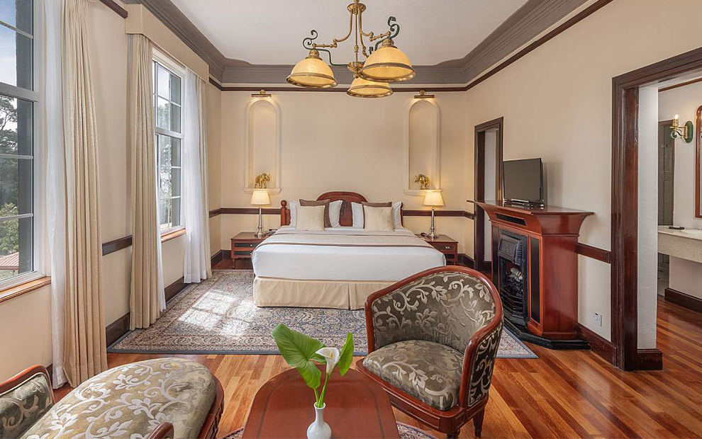 Crafted with discerning travelers in mind, the 2-bedroom, 1,260 sq ft Presidential Suite provides a sanctuary of opulence. It boasts a cozy fireplace seating area, along with a well-equipped dining space and pantry, ensuring every need is catered for.